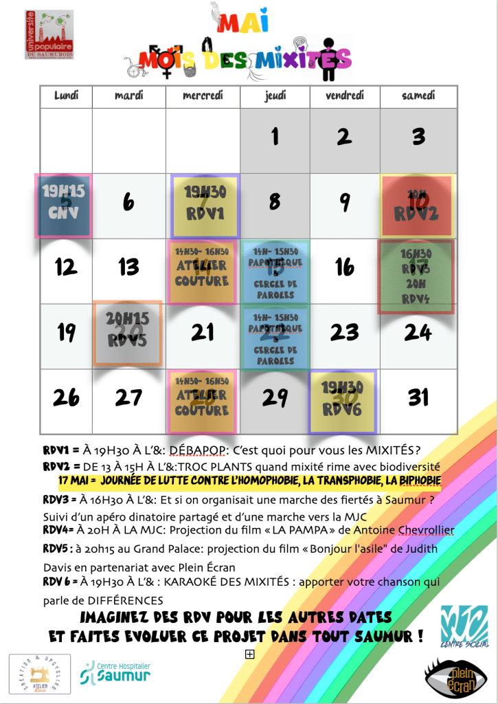 Le programme de nos actions est prêt mais si de votre côté ou dans votre structure vous voulez participer à rendre le mois de mai dans le saumurois encore plus actif sur l’acceptation des différences, n’hésitez pas à nous le faire savoir!