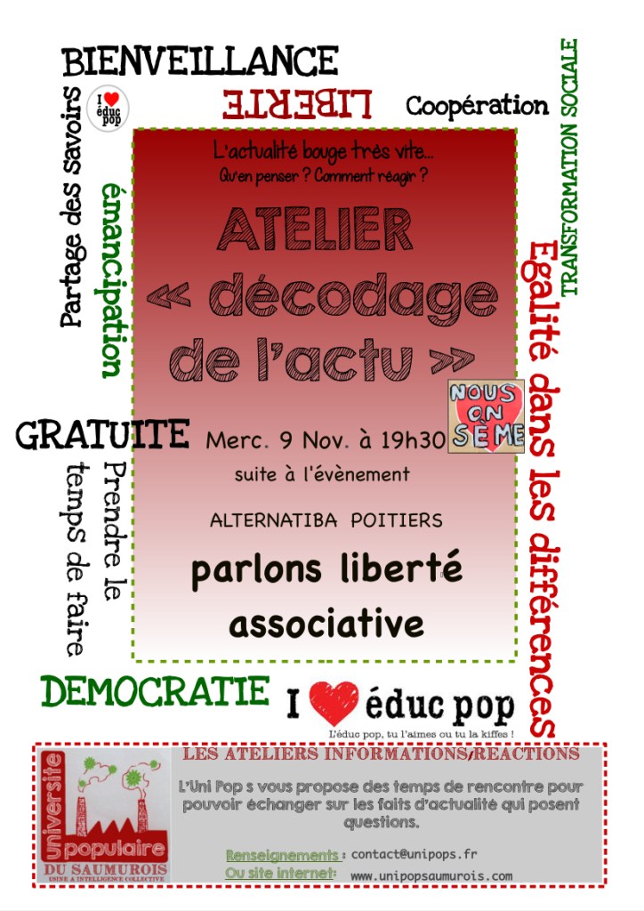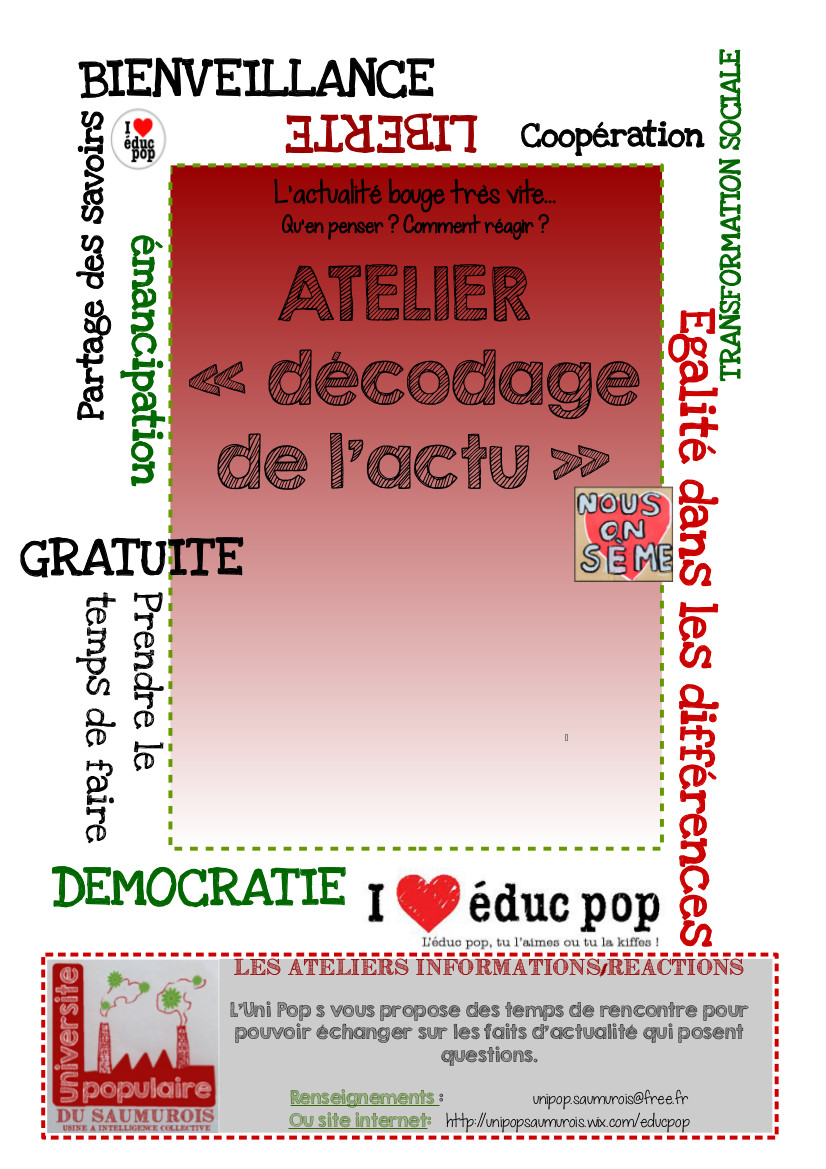 L’ ATELIER DÉCODAGE DE L’ACTU est né suite aux attentats de 2015 contre Charlie Hebdo; l’idée est de pouvoir se retrouver pour discuter ensemble d’un évènement marquant de l’actualité qui parfois nous bouleversent, nous perturbent, nous interrogent.