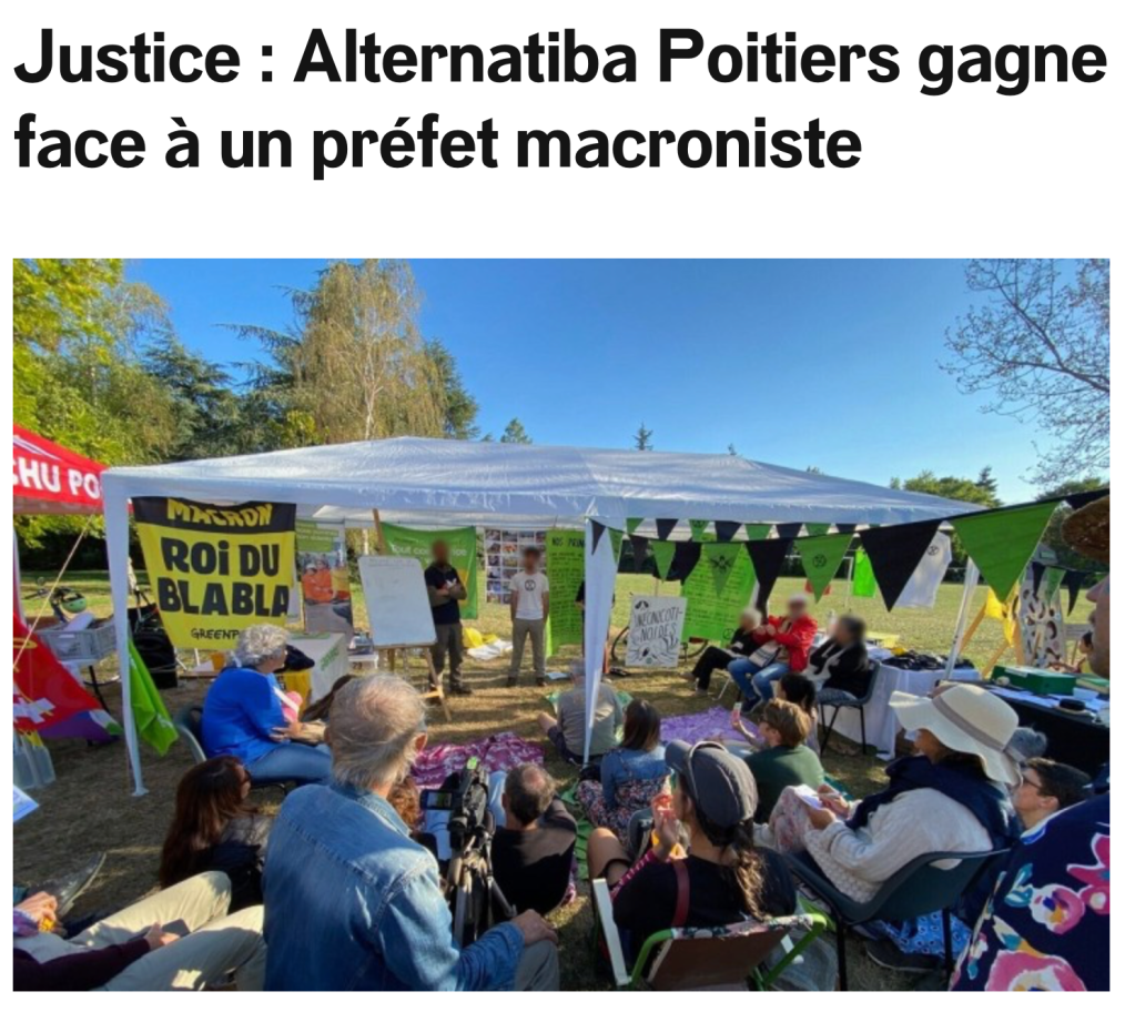 - septembre 2022 : l’association Alternatiba a obtenu de la ville de Poitiers le financement d’une journée en plein air avec des stands, des animations, etc. pour promouvoir l’écologie, la défense de l’environnement et tous les axes que développe Alternatiba qui s’affirme comme un mouvement non-violent pratiquant la désobéissance civile, à visage découvert et sans l’attaque des personnes
